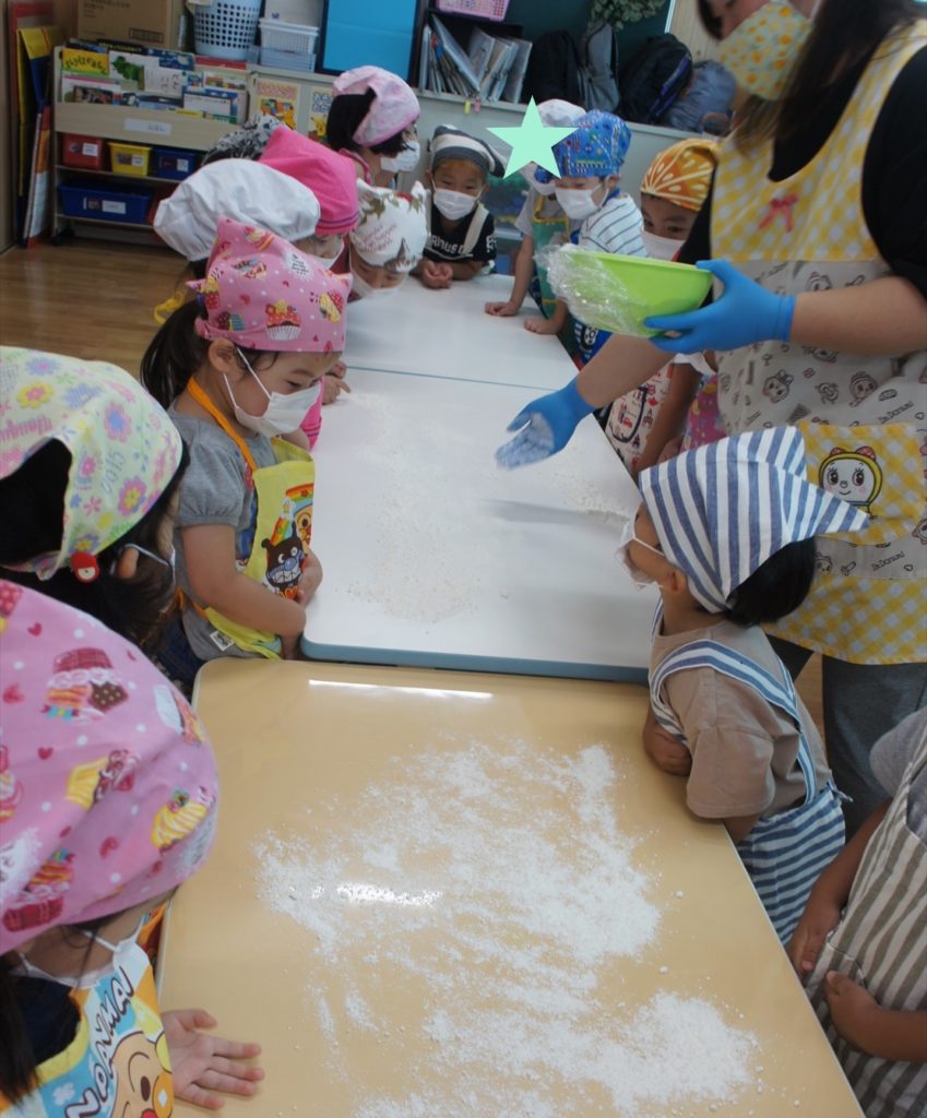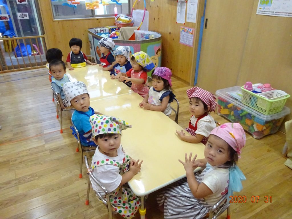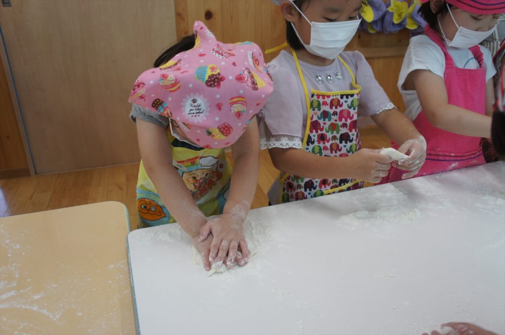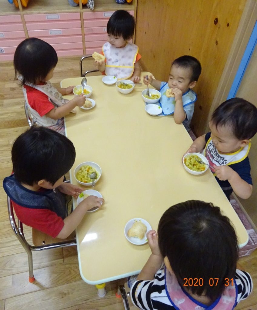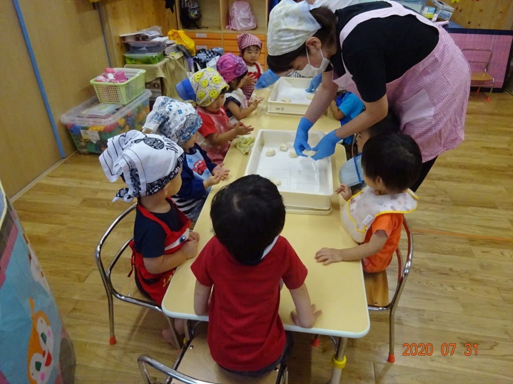 7月のおわりに、うさぎ組・きりん組・ぞう組の園児さんたちで、カレーパーティーを行いました!カレーと一緒に食べるパンをみんなでこねて作りましたよ。