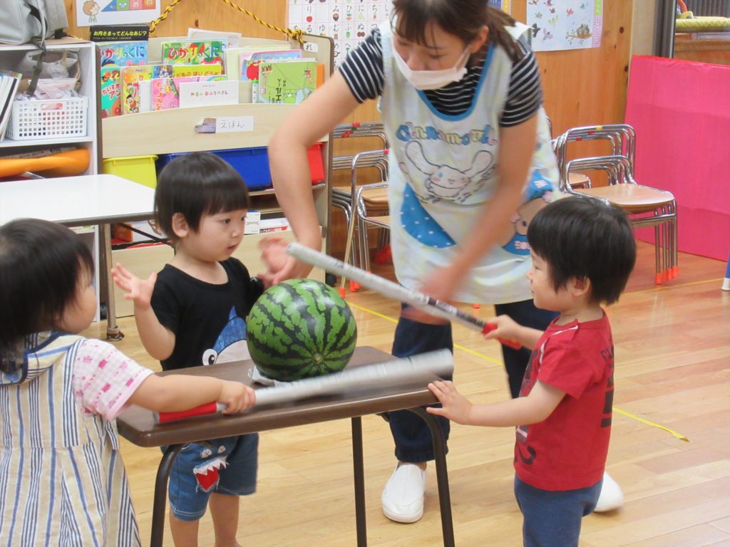 プールびらきの予定だった日は残念ながら雨でしたが、お部屋の中で毎年恒例のスイカ割りをしました。