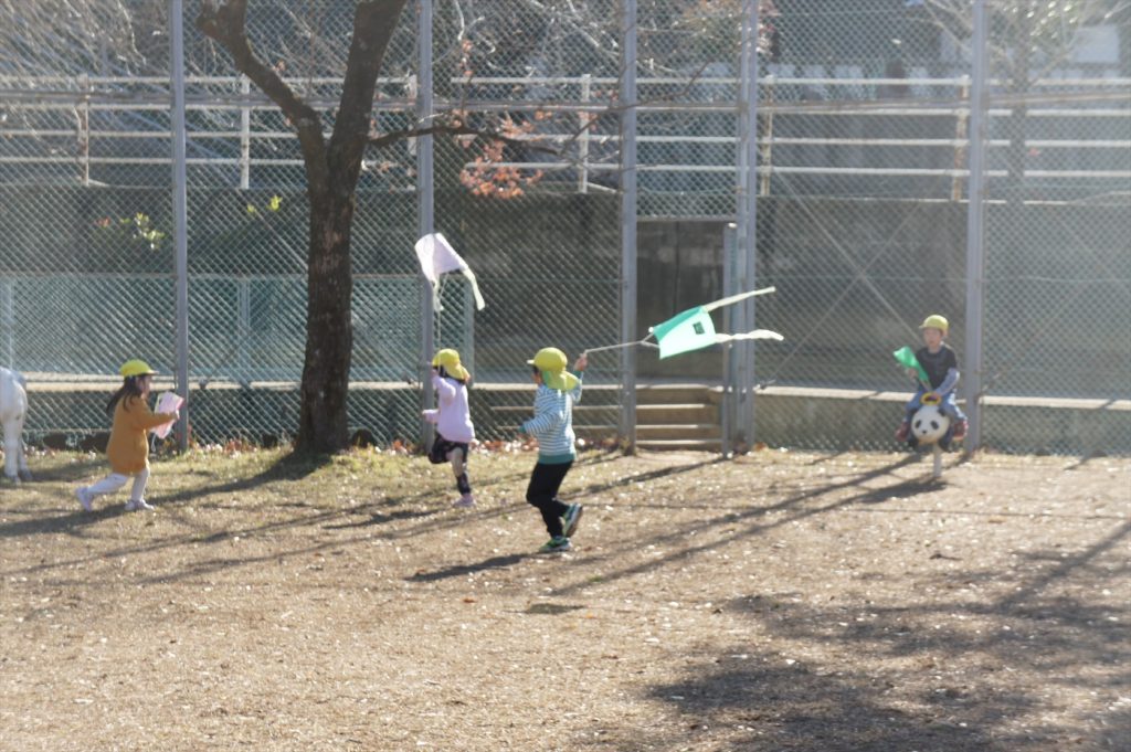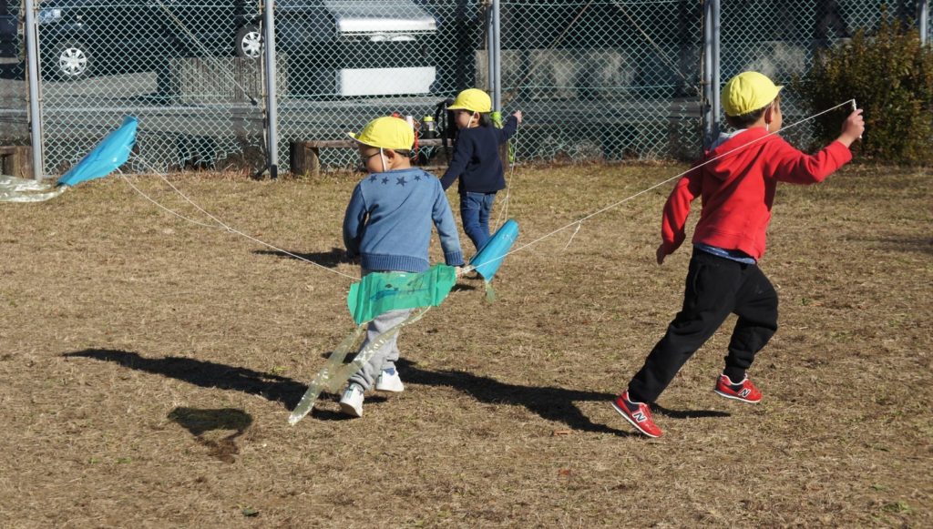 それぞれのクラスで、みんなでがんばって作った凧でたくさん遊びましたよ!