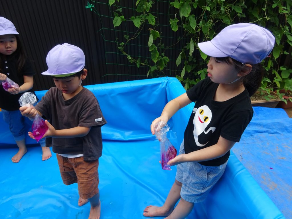 きれいな色水ができあがりました!おともだちと色の濃さを見比べてみたり、みんな興味をもって色水を作っていました。