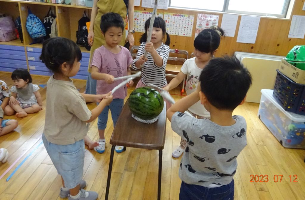 七夕とすいか割り 2023/7/28 行事 7月を迎え、白ゆりでも七夕など様々な行事を行いました! 七夕は今年もみんなで飾り付け!みんなで作った飾りとお願いごとを書いた短冊を飾りました。 プールも始まりました!みんなで楽しくプールあそびを行っています! プールびらきの日は、恒例のすいか割りも行いました。今年は本物のすいかを使ってすいか割りに挑戦しました! みんなで協力してすいか割り! ひよこ組さんも挑戦! 夏を迎え、今年も暑い日々が続いております。子どもたちの体調にはより一層気を付けて保育を行って参ります。