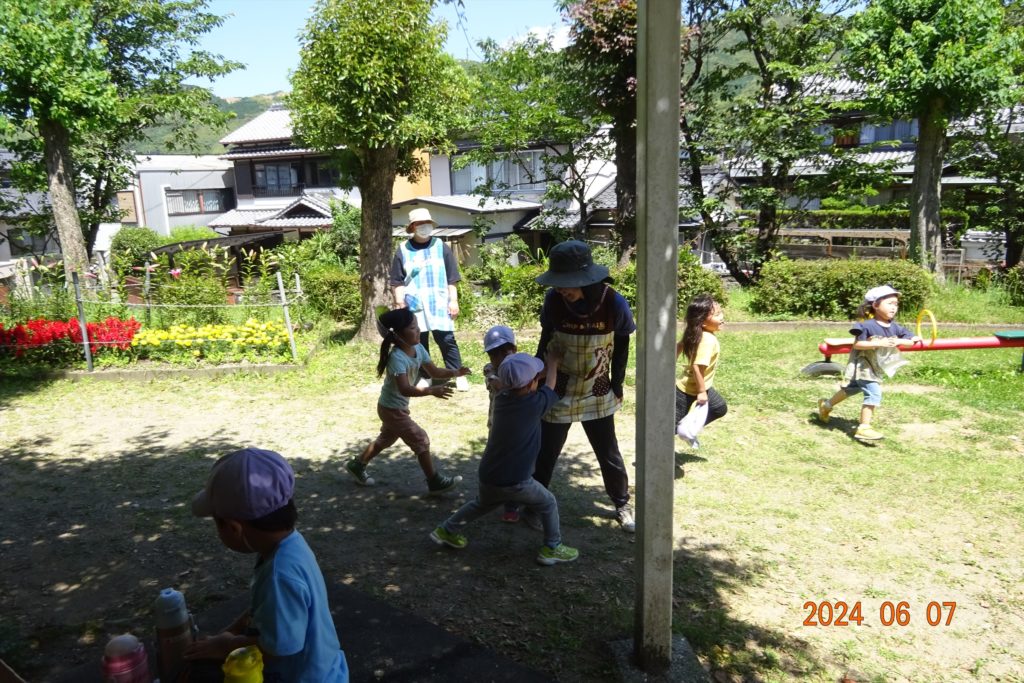 保育所では、天気が良い日には園庭での遊びだけでなく近所の公園や神社にも遊びに行っています!