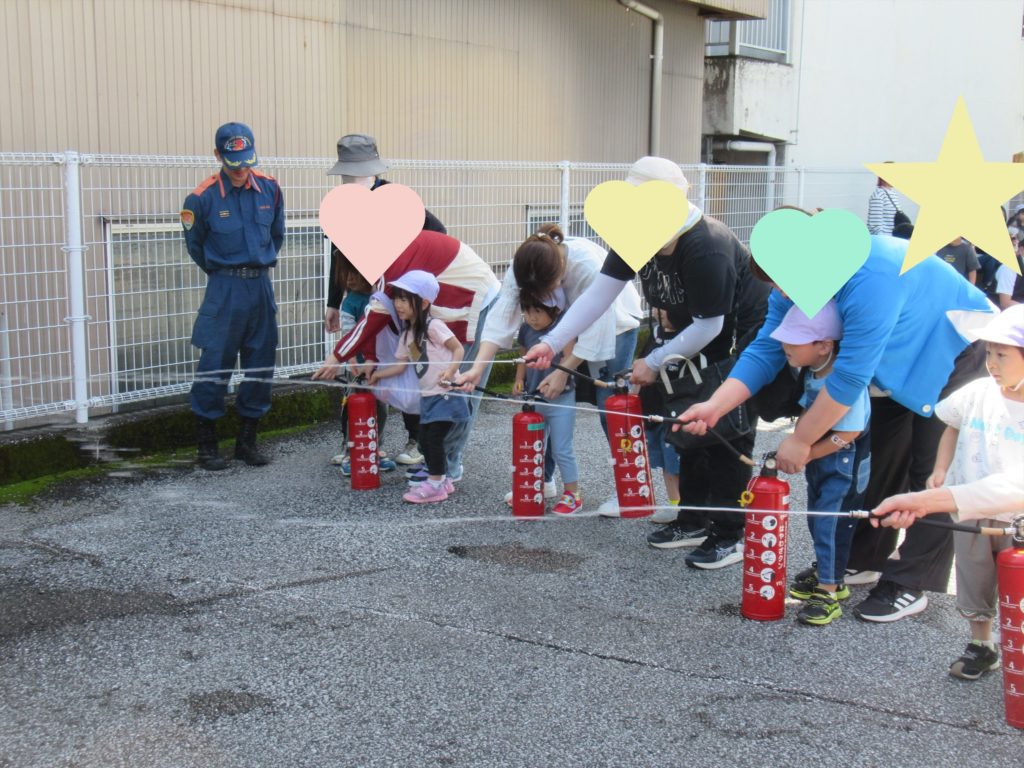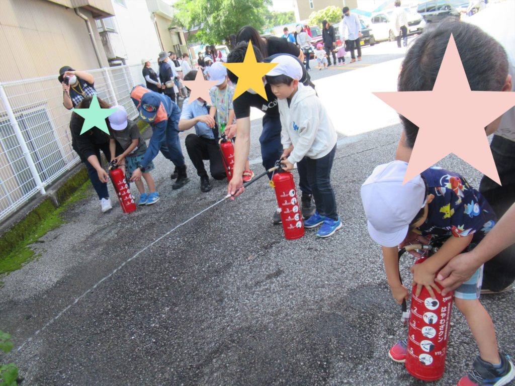 消防士さん立ち会いのもと、水消火器を使っての消火訓練も行いました!