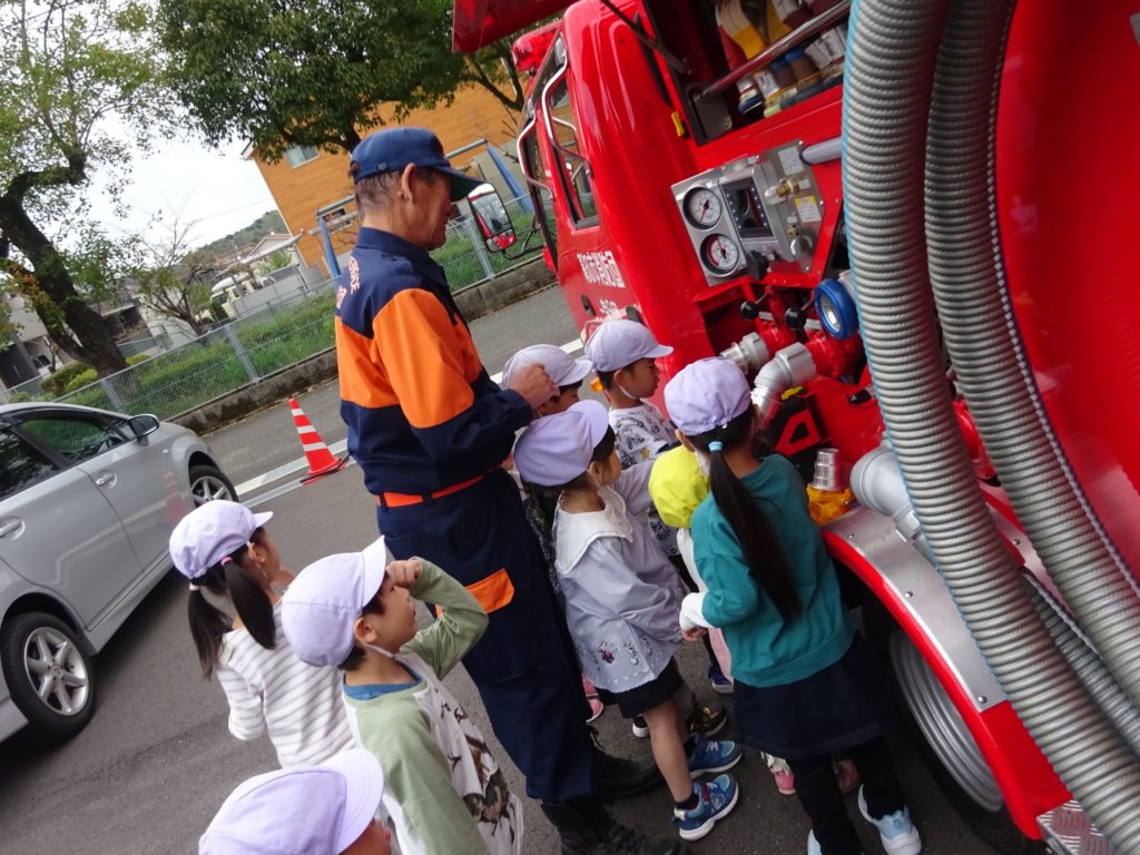お話を聞いた後、消防車や屯所の見学もさせていただきました!みんな興味津々で見て回っていましたが、消防団の方々にとても優しく対応していただけました。ご協力本当にありがとうございました!